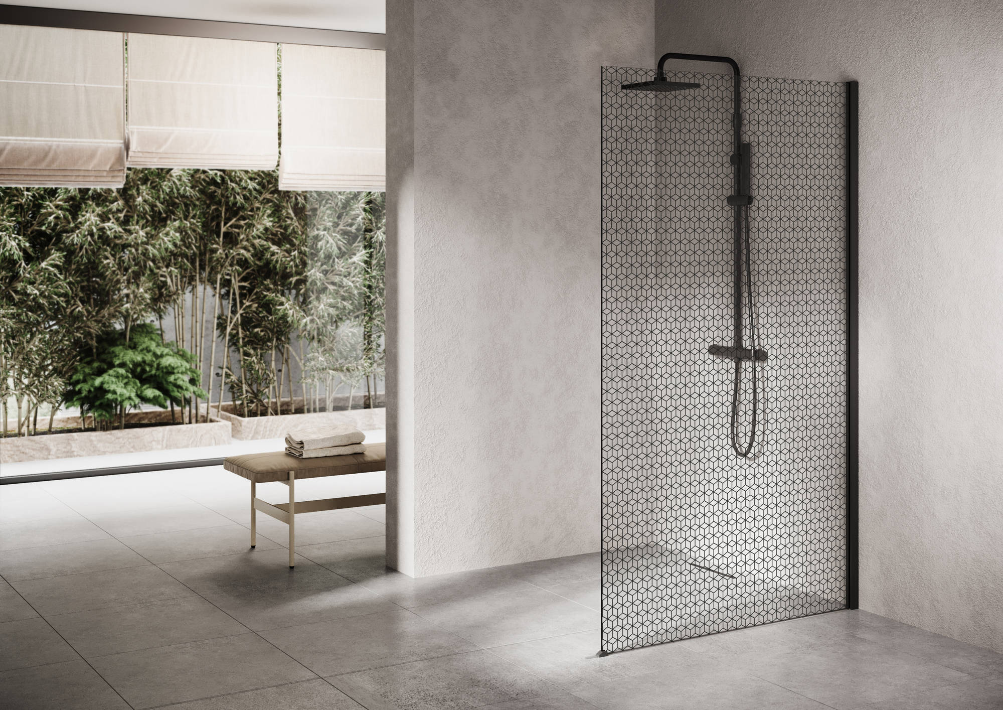 De Ben Delphi inloopdouche is voorzien van een mat zwart profiel en donker glas met een stijlvol patroon. Deze unieke douchewand is een aanrader voor iedere badkamer.